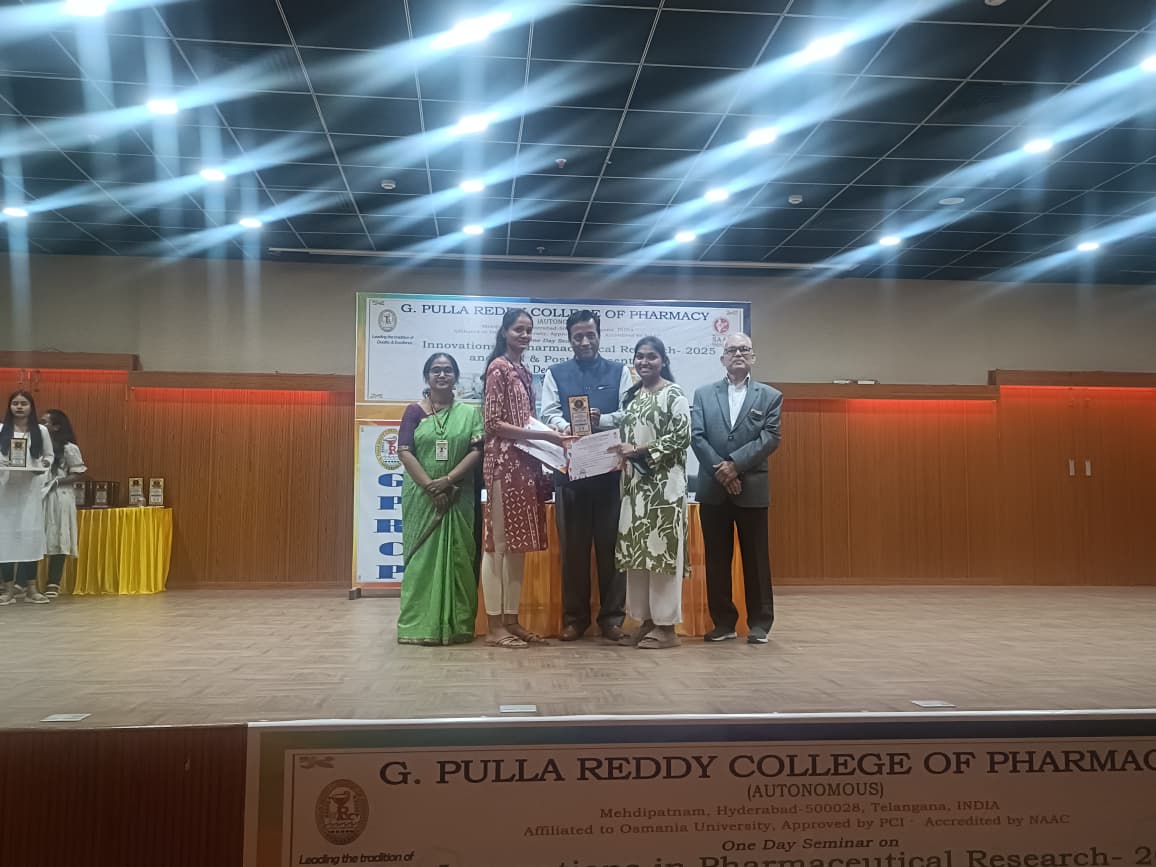 During the One-Day Seminar on “Innovations in Pharmaceutical Research 2025” held on 6th December 2025, Pharm.D 4th-year students Sreeja and Jessica Rani received the Best Oral Presentation Award.
