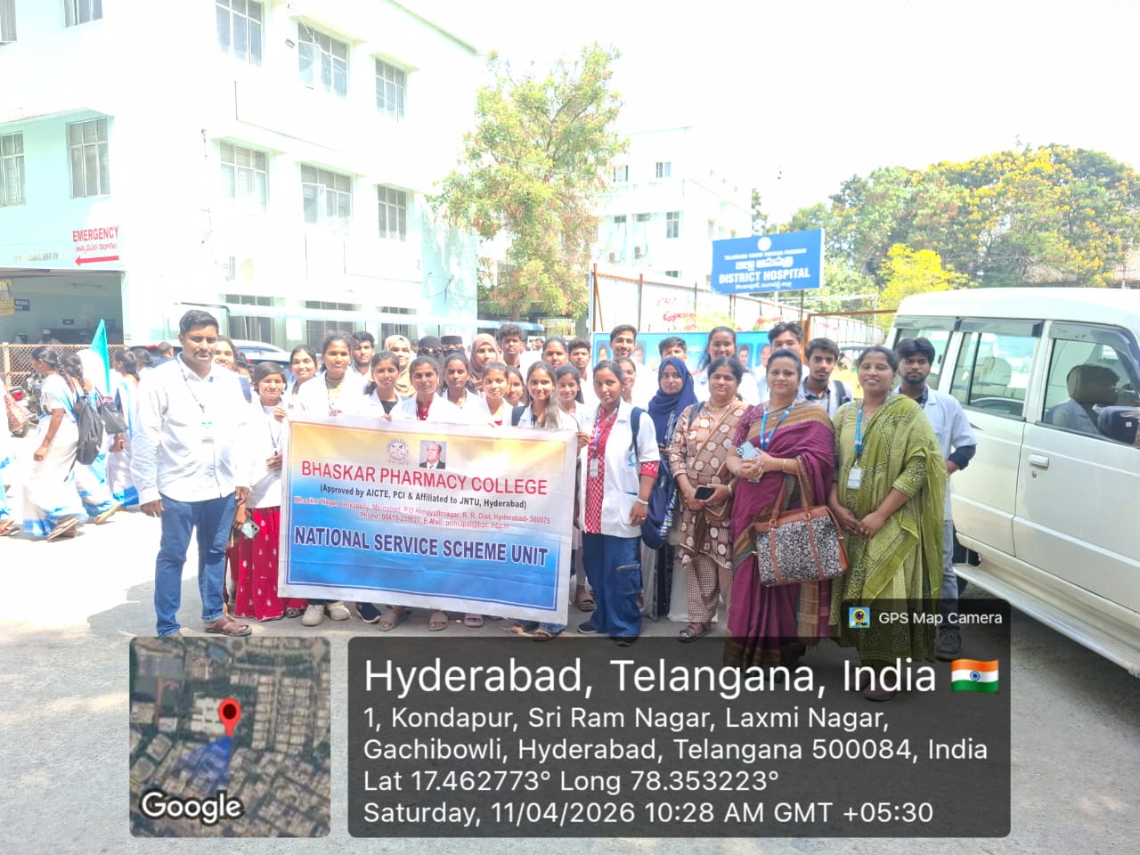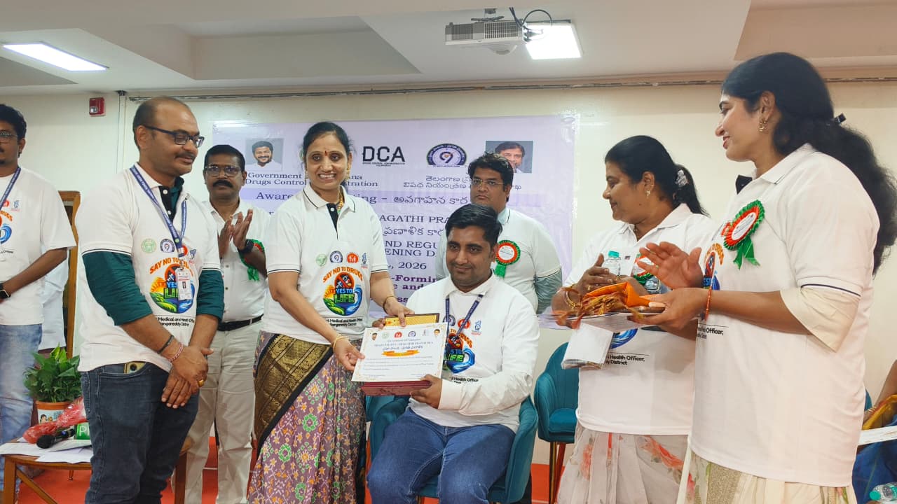 Bhaskar Pharmacy College participated in the ‘Health Week’ (April 6–11, 2026) under the ‘Praja Palana – Pragati Pranalika’ programme, where April 11 was observed as ‘Drug Control Regulatory Strengthening Day’ and an awareness rally was conducted at Government District Hospital, Kondapur in collaboration with the Drugs Control Administration and Narcotic Eagle Force, Telangana to promote medicine safety and prevent drug abuse. Students also won prizes and were felicitated on 11.04.2026 at the same venue for their active participation in Essay Writing, Elocution, and Debate competitions on “Drug Abuse” held on 10.04.2026 in association with the Drugs Control Administration, Telangana.