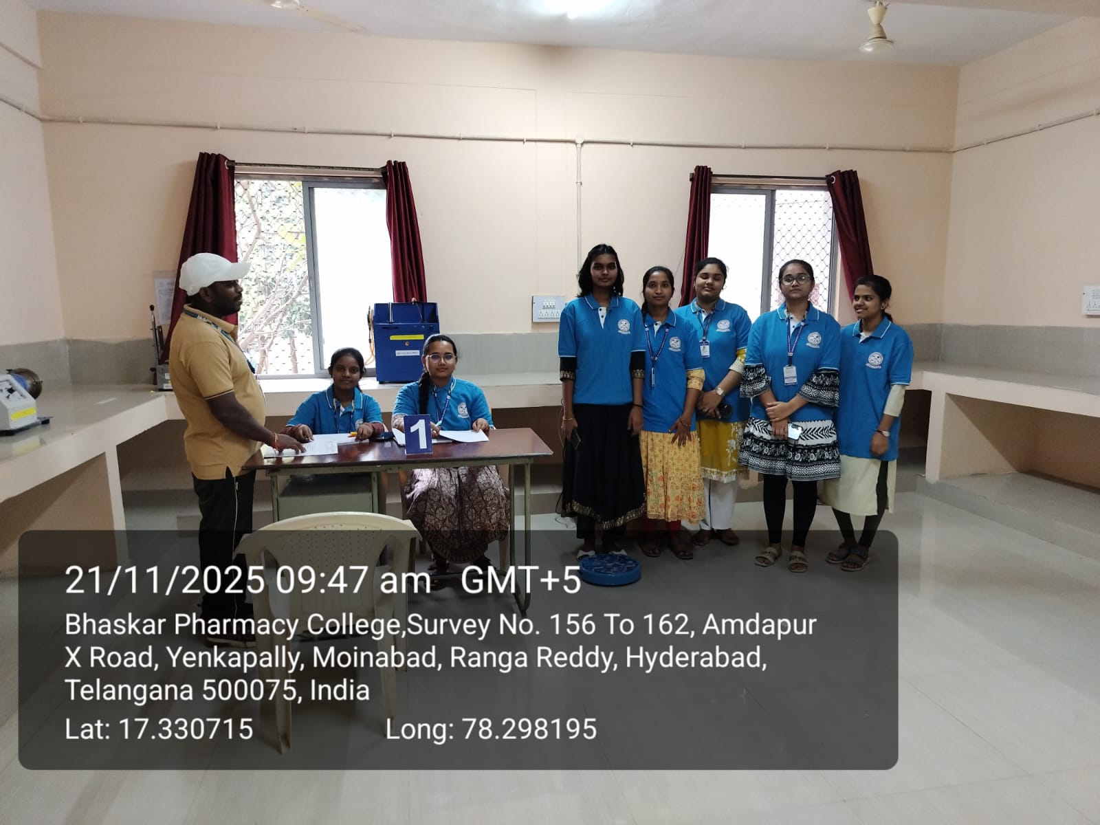 Bhaskar Pharmacy College conducted a Blood Donation Camp on 21st November 2025 in collaboration with Niloufer Hospital for Women & Children. More than 65 staff members and students actively participated and donated blood.