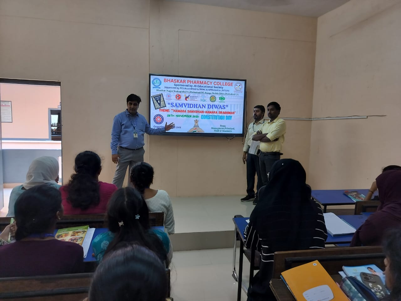The NSS unit of Bhaskar Pharmacy College organized a seminar on the occasion of Samvidhan Divas on 26th November 2025, during which the students also took a pledge on the Preamble of the Indian Constitution.